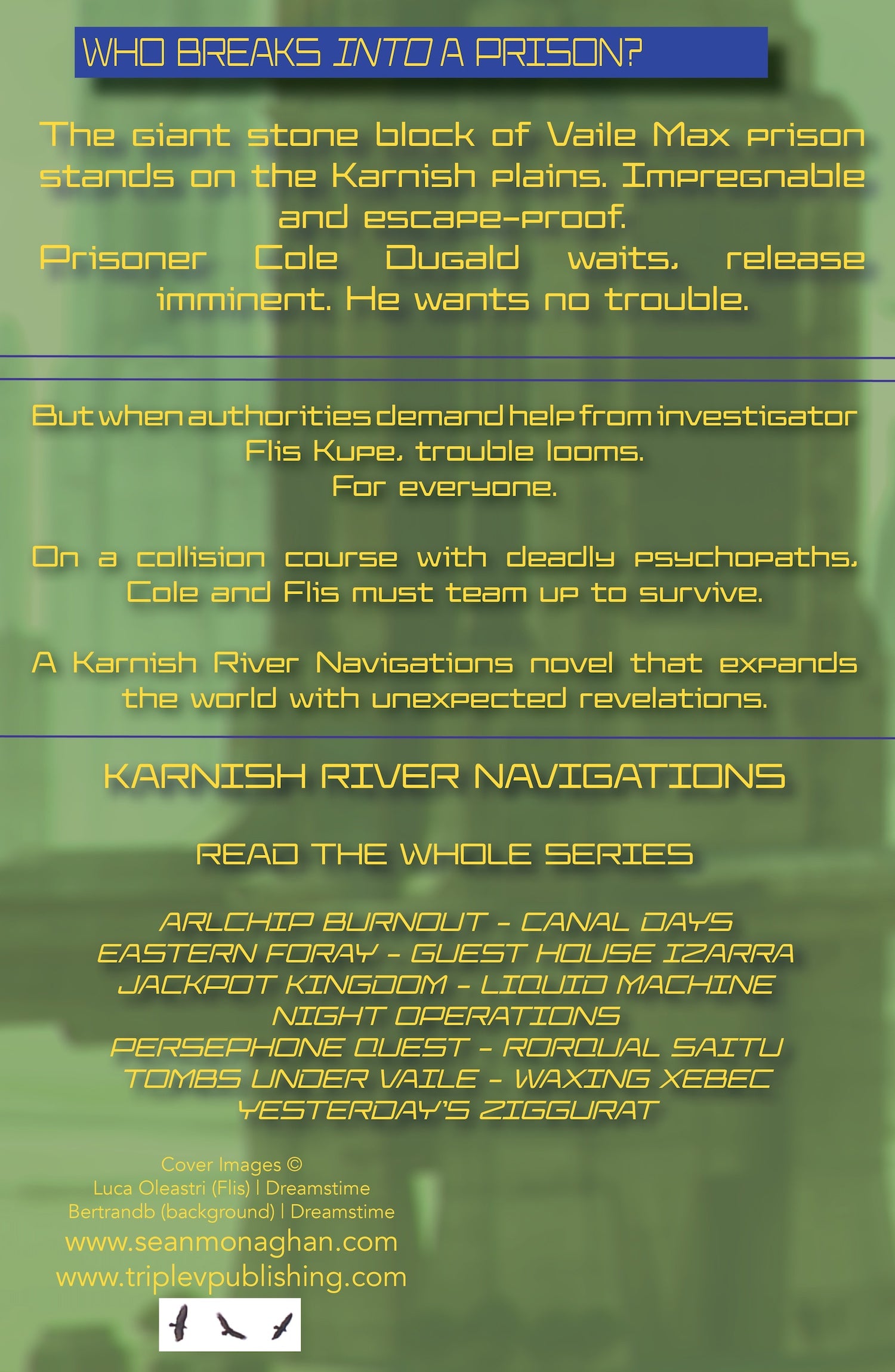 The giant stone block of Vaile Max prison stands on the Karnish plains. Impregnable and escape-proof. Prisoner Cole Dugald waits, release imminent. He wants no trouble. But when authorities demand help from investigator Flis Kupe, trouble looms. For everyone. On a collision course with deadly psychopaths, Cole and Flis must team up to survive. A Karnish River Navigations novel that expands the world with unexpected revelations.